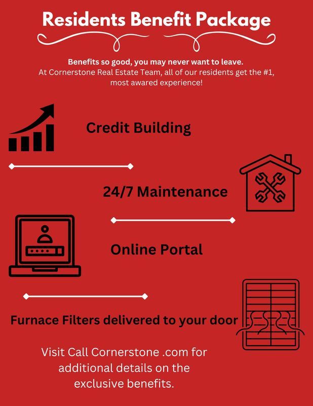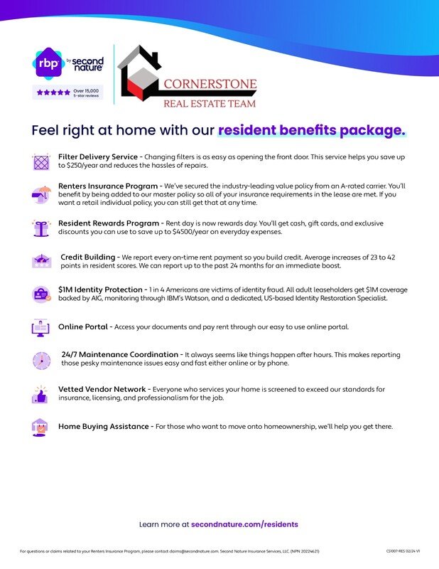 Many of our properties accept pets. All applicants are required to go to OurPetPolicy and complete a no animal, pet, or assistance animal profile. A refundable deposit of $300 and monthly pet fee of $35 applies to all pets. We will make reasonable accommodations for assistance Animals. Please have all certifications for the animal completed prior to submitting an Animal Profile. All documentation will be verified by a third party. Lastly, we deny any applicants with any felonies or evictions within the past 3 years, any debt collection from previous management companies, and any fraudulent documents. We do not accept violent felons or registered sex offenders. All Cornerstone Real Estate Team residents are enrolled in the Resident Benefits Package (RBP) for $14-$22 per month which includes HVAC air filter delivery (for applicable properties), credit building to help boost your credit score with timely rent payments, $1M Identity Protection, utility concierge service making utility connection a breeze during your move-in, our best-in-class resident rewards program, and much more! More details upon application. You can see all our available rentals at www.callcornerstone.com.